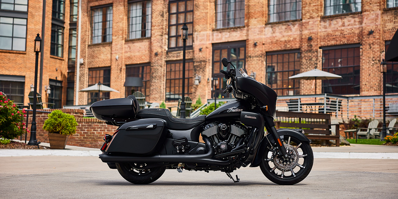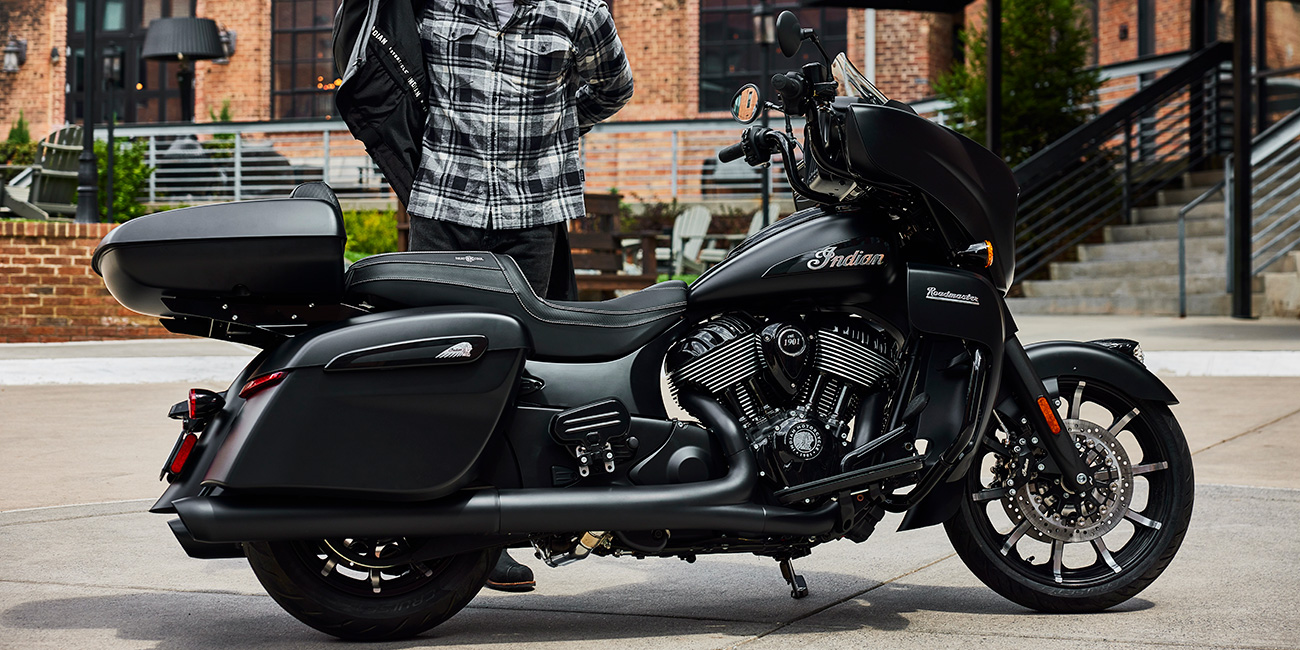 Avec ses lignes plus nettes et son design sombre, l'Indian Roadmaster Dark Horse entièrement équipée est une moto de tourisme magistrale.