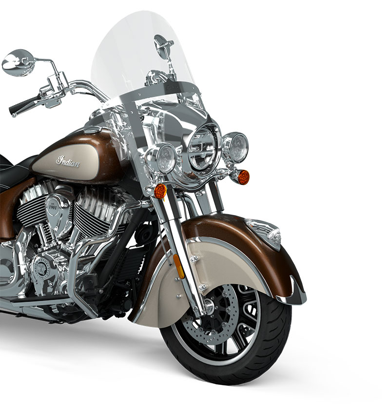 Pare-brise à attache rapide ; selle en vinyle ; sacoches rigides à verrouillage à distance, barres d'autoroute ; surveillance de la pression des pneus ; barre lumineuse ; ABS ; régulateur de vitesse ; allumage sans clé ; badge Indian® Script Tank